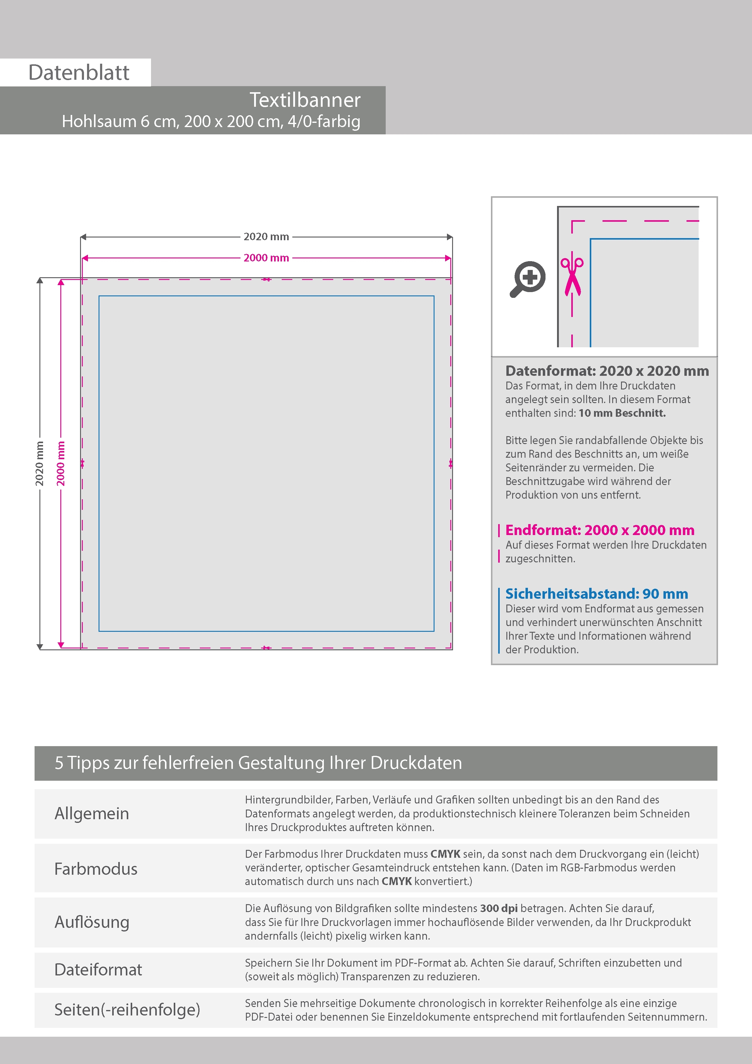 Hochwertige Stoff-Banner 200 x 200 cm, 4/0-farbig bedruckt, Hohlsaum links und rechts (Durchmesser Hohlsaum 6,0 cm)
