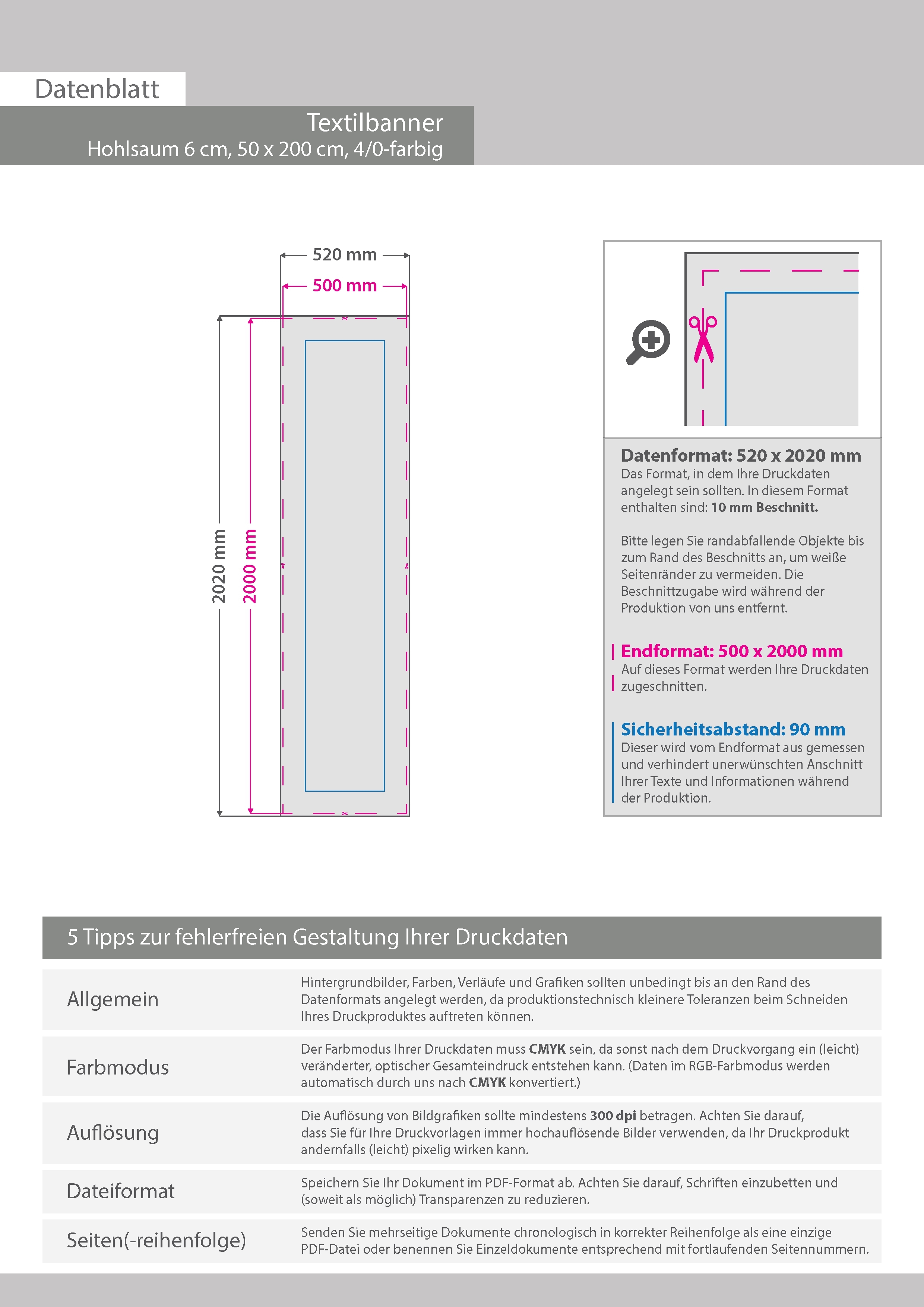 Hochwertige Stoff-Banner 50 x 200 cm, 4/0-farbig bedruckt, Hohlsaum oben und unten (Durchmesser Hohlsaum 6,0 cm)