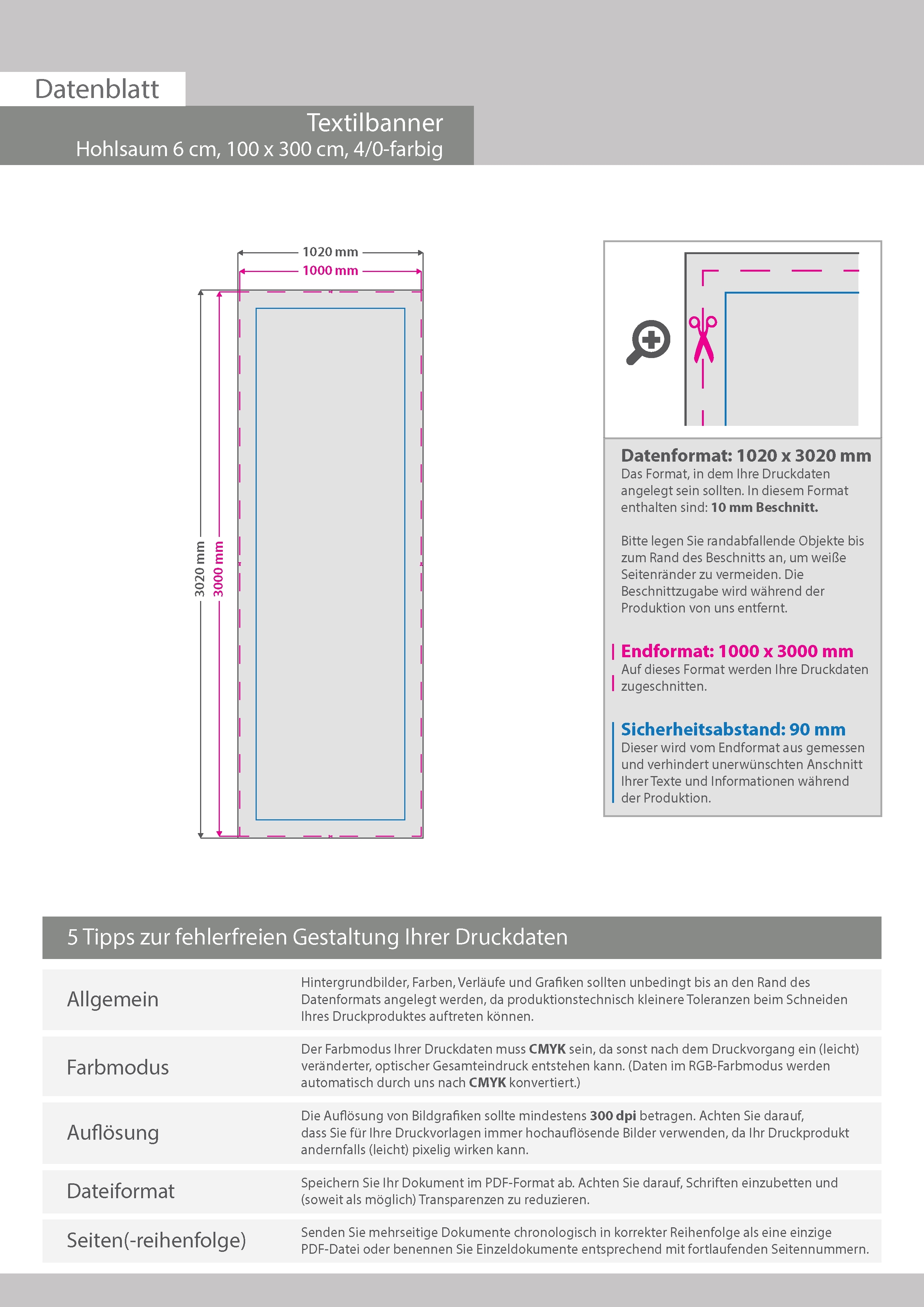 Hochwertige Stoff-Banner 100 x 300 cm, 4/0-farbig bedruckt, Hohlsaum oben und unten (Durchmesser Hohlsaum 6,0 cm)